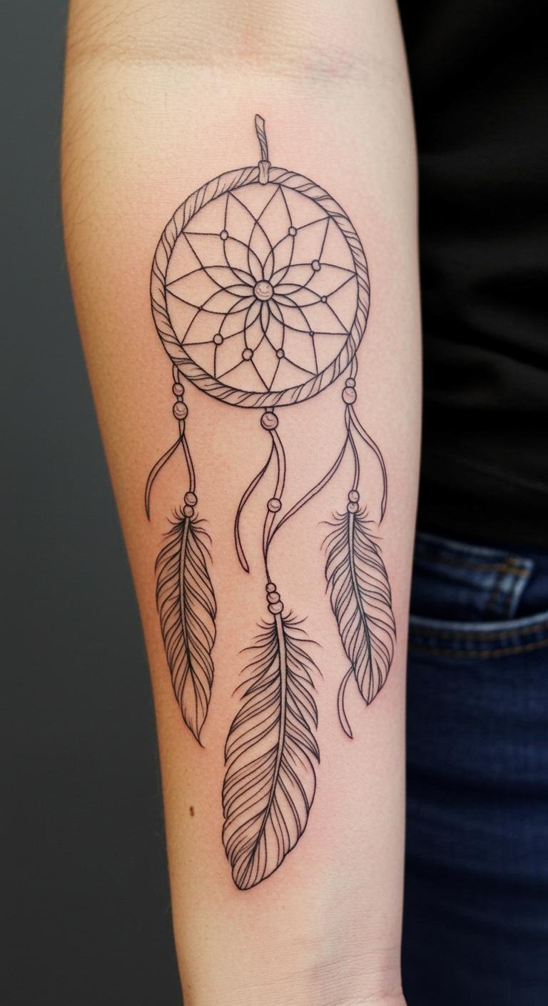 This dreamcatcher tattoo symbolizes the safeguarding of dreams and the flow of positivity in one’s life. Positioned on the inner forearm, it serves as a personal reminder of aspirations and the spiritual journey.