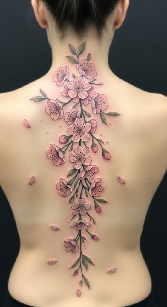This cherry blossom spine tattoo embodies the transient beauty of nature, elegantly tracing the contours of the back. Each blossom symbolizes renewal and hope, reminding the wearer of life’s fleeting moments.