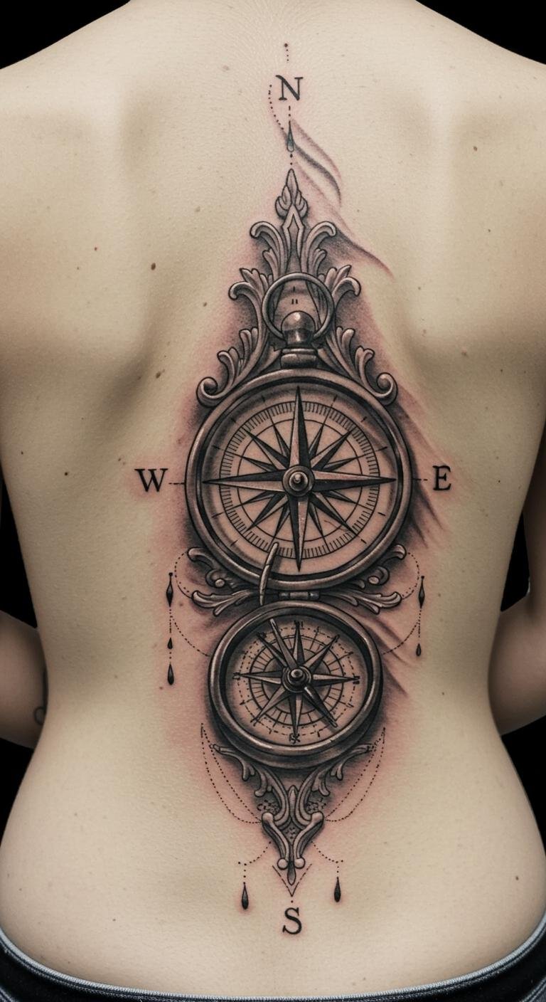 The compass represents adventure and discovery, encouraging exploration and growth. Positioned along the spine, it not only complements the body’s natural silhouette but also fosters a sense of inner strength and direction.