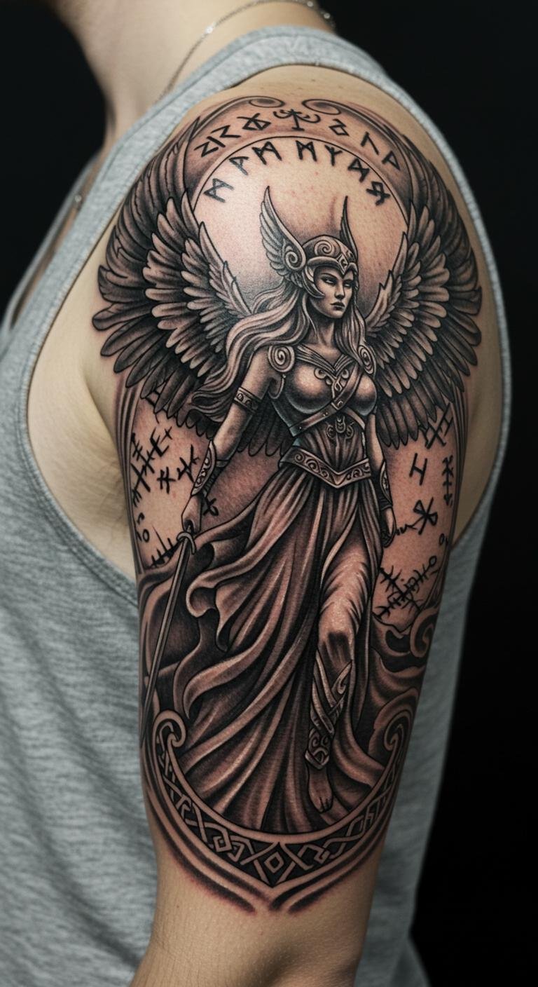 This tattoo design captures the essence of Valkyrie mythology, symbolizing strength, bravery, and the guiding spirit of fallen warriors.