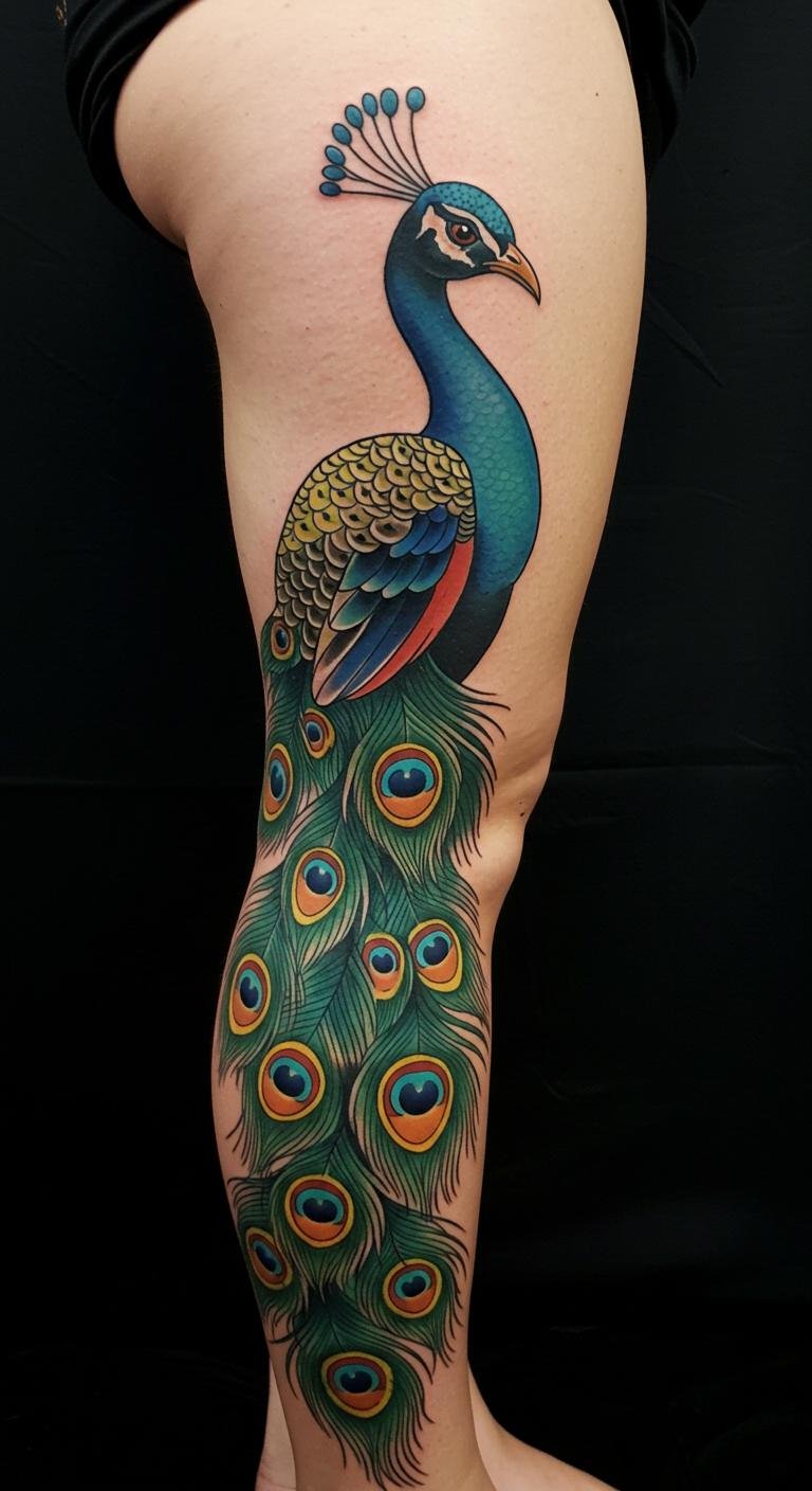 This Traditional Peacock Leg Tattoo embodies freedom, beauty, and self-expression through its vivid imagery and symbolism.
