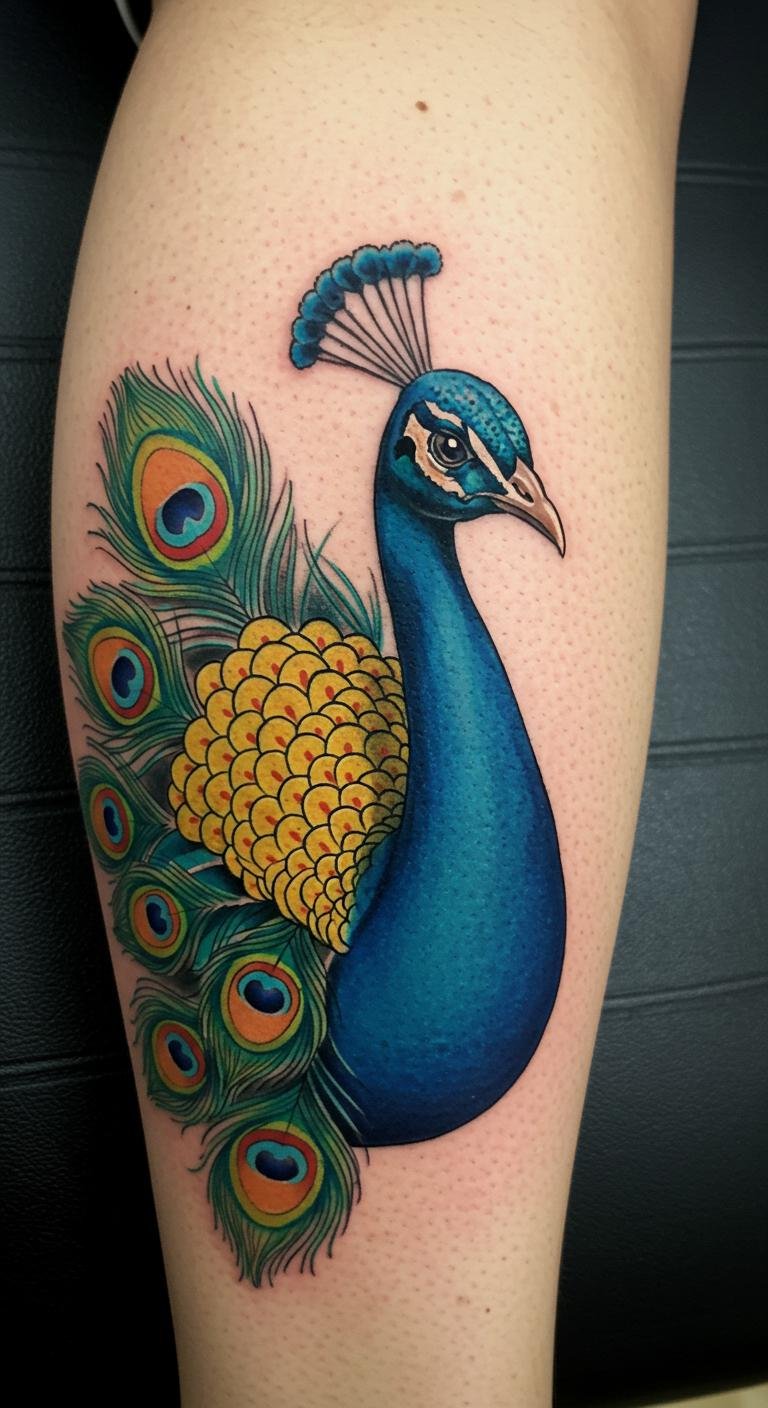 The neo-traditional peacock calf tattoo symbolizes beauty and freedom, embodying the spirit of self-expression.