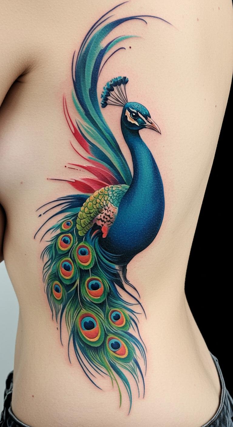 This vibrant peacock tattoo symbolizes freedom, individuality, and the celebration of one’s unique journey.
