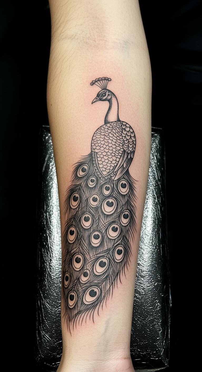This ornamental peacock tattoo symbolizes beauty, freedom, and individuality, making it a powerful statement piece on the upper forearm.