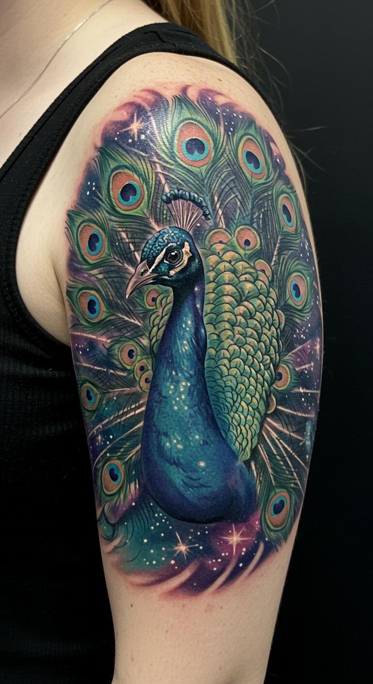 The celestial peacock tattoo on the shoulder symbolizes freedom, individuality, and the beauty of the cosmos. Its vibrant hues reflect the colors of the universe, while the graceful design captures the essence of soaring above limitations.