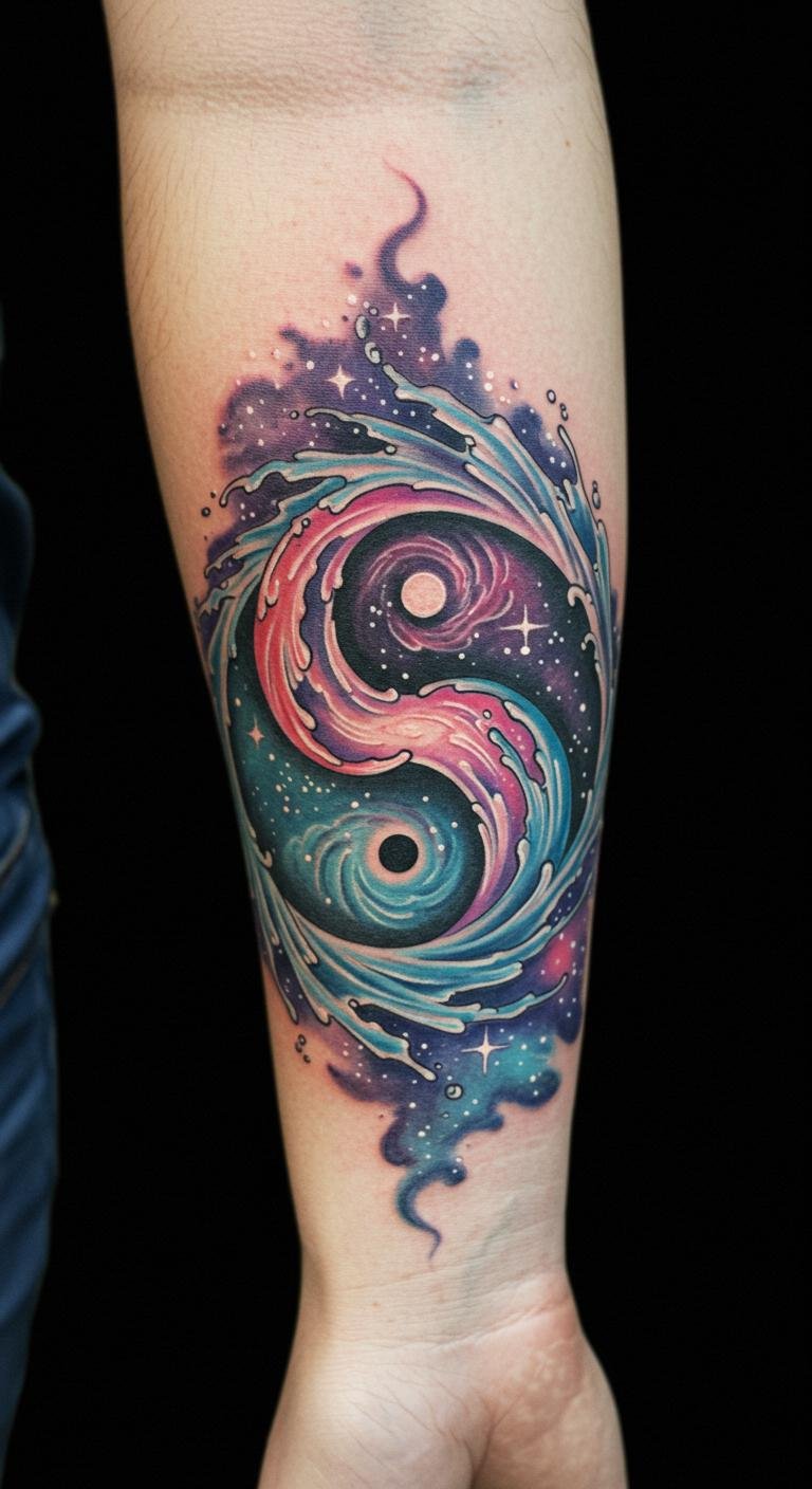 This tattoo beautifully symbolizes the equilibrium of dualities and the mystical nature of the universe, making it a profound choice for those who resonate with the themes of balance and cosmic exploration.