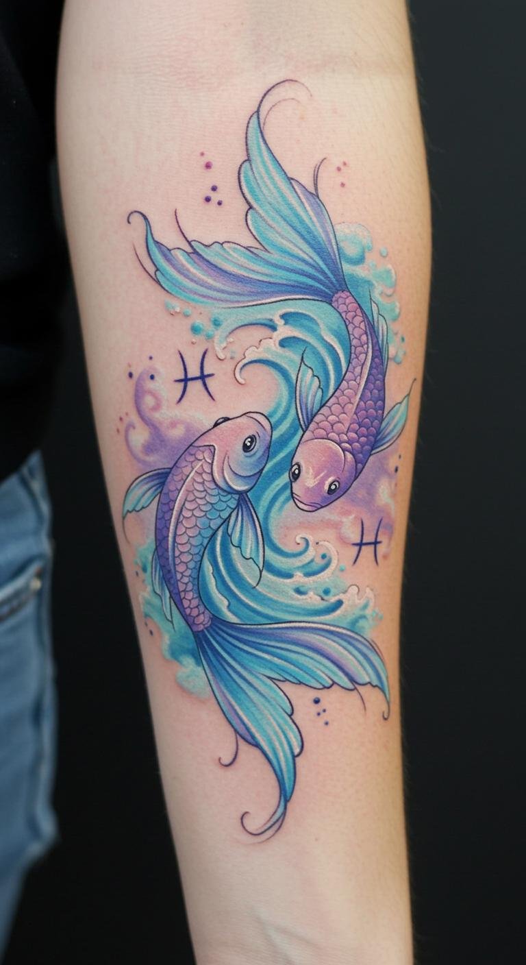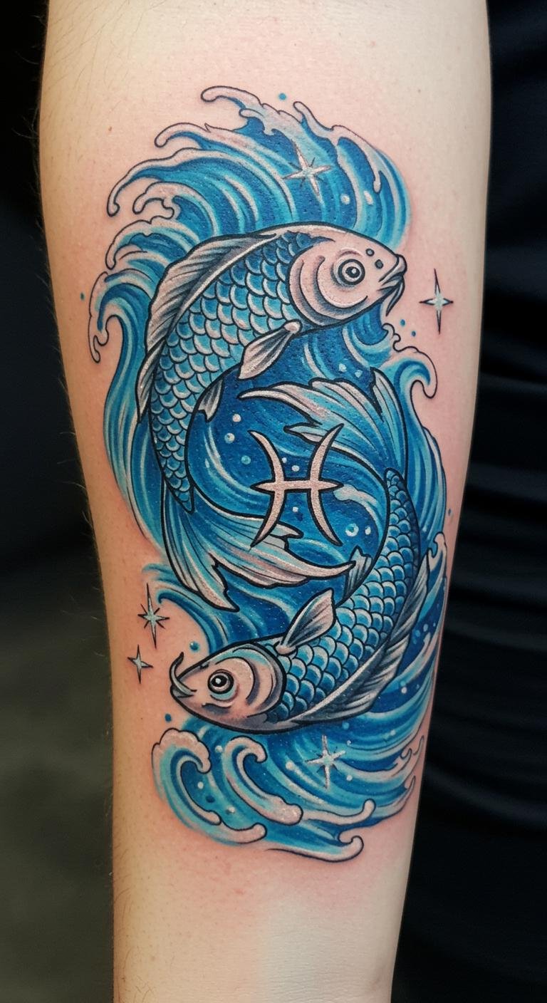 This tattoo symbolizes the free-spirited nature of Pisces, reflecting creativity and joy through the lively depiction of the fish and waves.