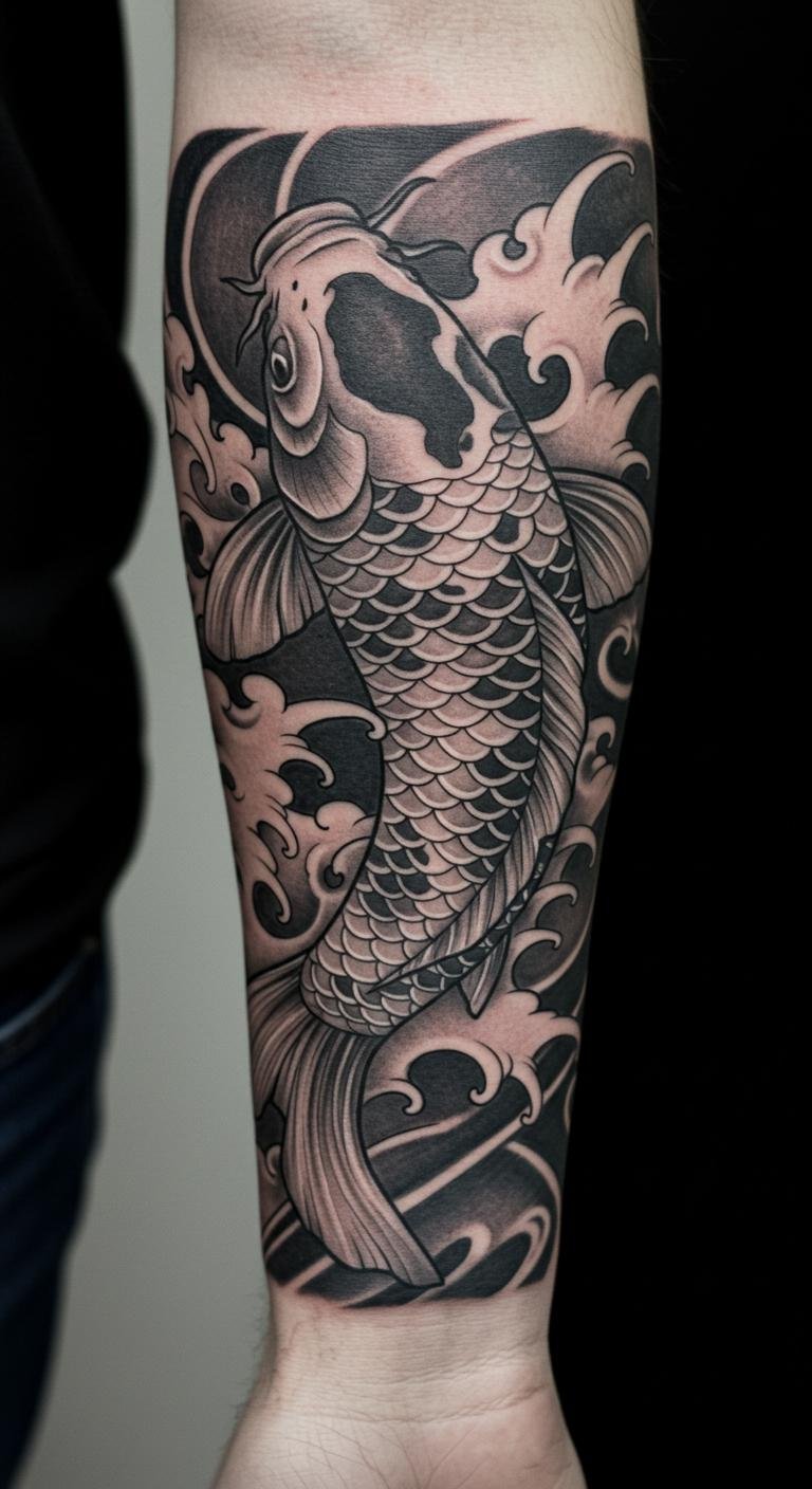 The Koi fish represents resilience and transformation, embodying the wearer’s journey through life. The monochrome palette reflects balance and harmony, while the visible skin texture adds to its realism.