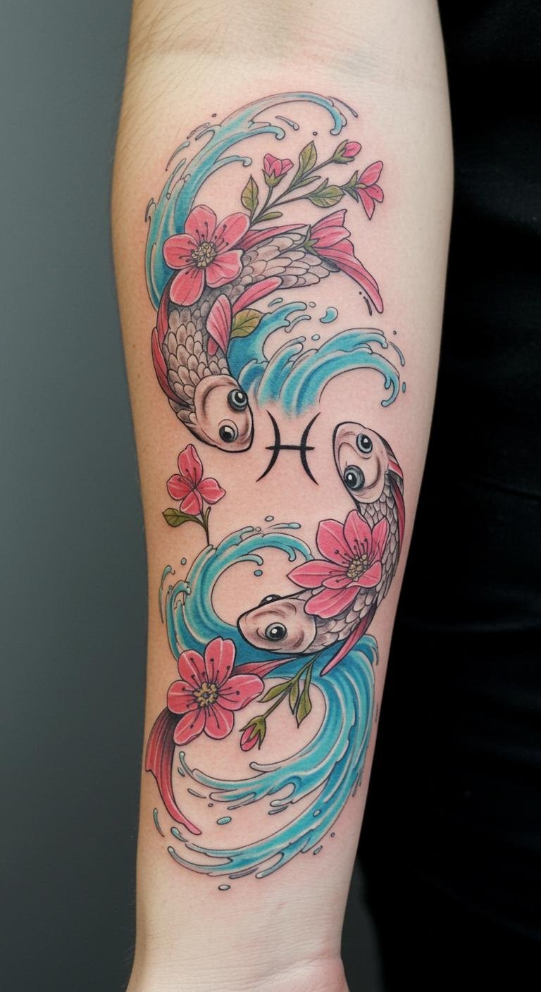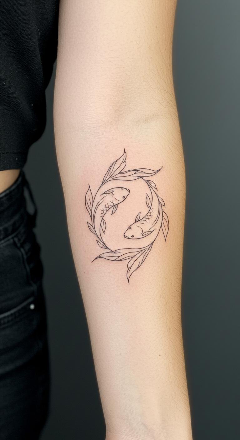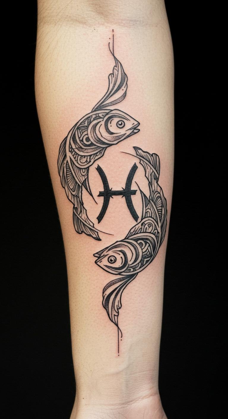 This tattoo symbolizes the duality and emotional depth of Pisces, representing intuition, creativity, and the fluidity of life.