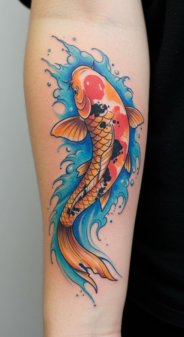 The Koi fish tattoo symbolizes strength and perseverance, embodying the traits of the Pisces sign. Its placement on the forearm allows for visibility and personal expression, making it a daily reminder of resilience and harmony.
