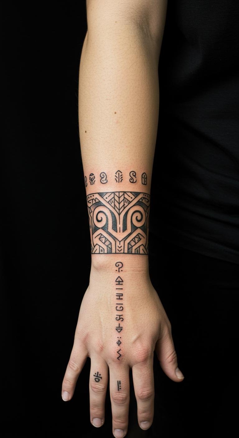 The interlocking designs of this wrist tattoo symbolize the deep ties to Polynesian heritage and individual journeys. Each pattern represents a facet of cultural history, while the flow of the tattoo signifies unity and continuity in personal identity.