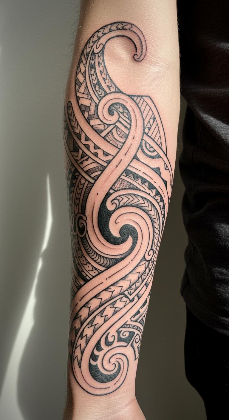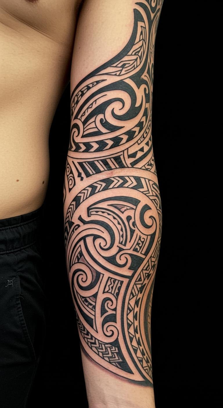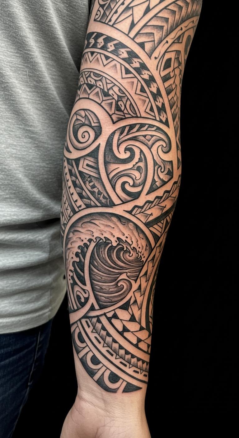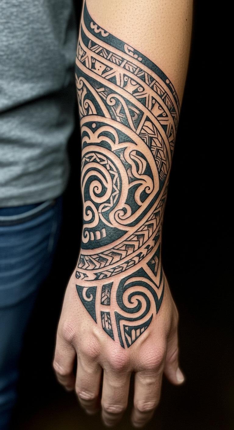 This stunning forearm tattoo captures the essence of Polynesian culture, linking the wearer to their heritage through its intricate designs. The swirling ocean waves symbolize strength and resilience, while the geometric shapes represent unity and connection to the land and ancestors. Placed on the forearm, the tattoo is both visible and personal, allowing the wearer to share their story with others while maintaining a deep connection to their roots.