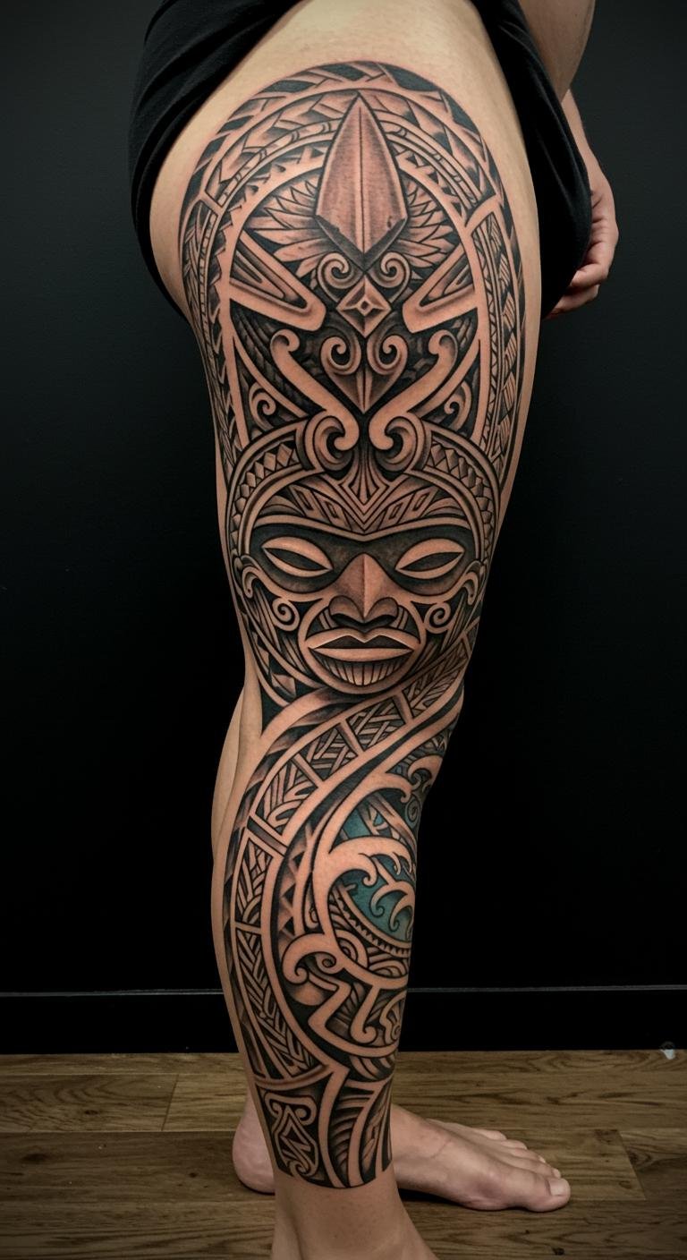 Polynesian Leg Sleeve Tattoo With Cultural Narratives
