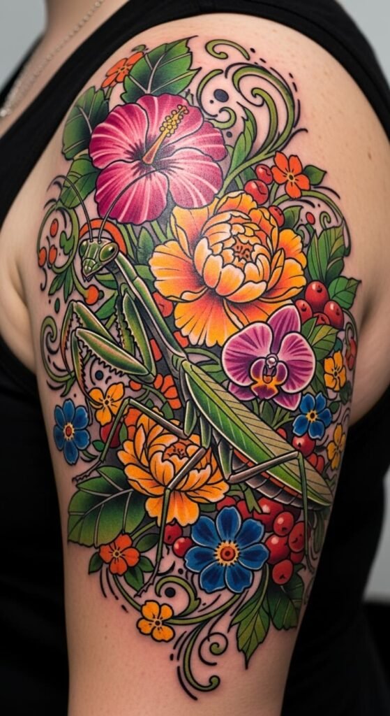 Praying Mantis Tattoo With Bright Floral Surroundings