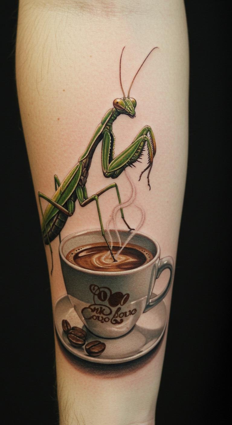 Positioned on the forearm, it invites daily reminders to savor life’s little pleasures. The mantis represents focus and mindfulness, making it an inspiring piece that resonates deeply with coffee enthusiasts and art lovers alike.