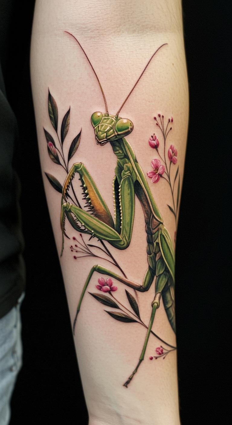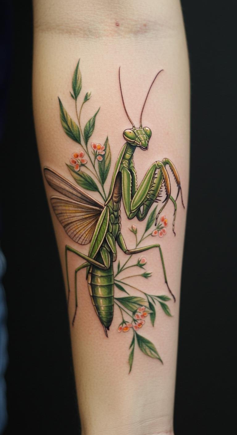 Nature-Inspired Praying Mantis Tattoo With Floral Accents