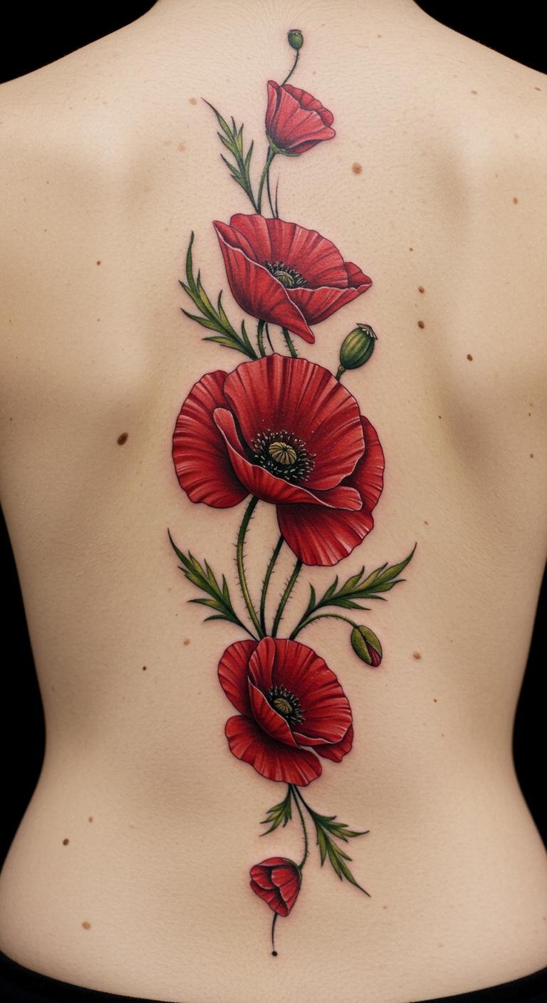 The Red Poppy Spine Tattoo embodies a balance of strength and tranquility, symbolizing sleep and peace.