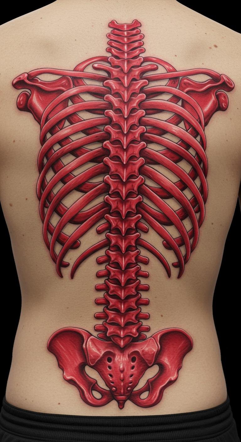 This Red Skeleton Spine Tattoo powerfully symbolizes the duality of strength and vulnerability inherent in the human experience.
