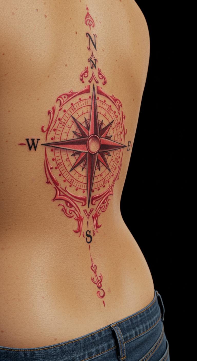 This Red Compass Spine Tattoo symbolizes a journey filled with direction and exploration, serving as a reminder to navigate life’s challenges with confidence.