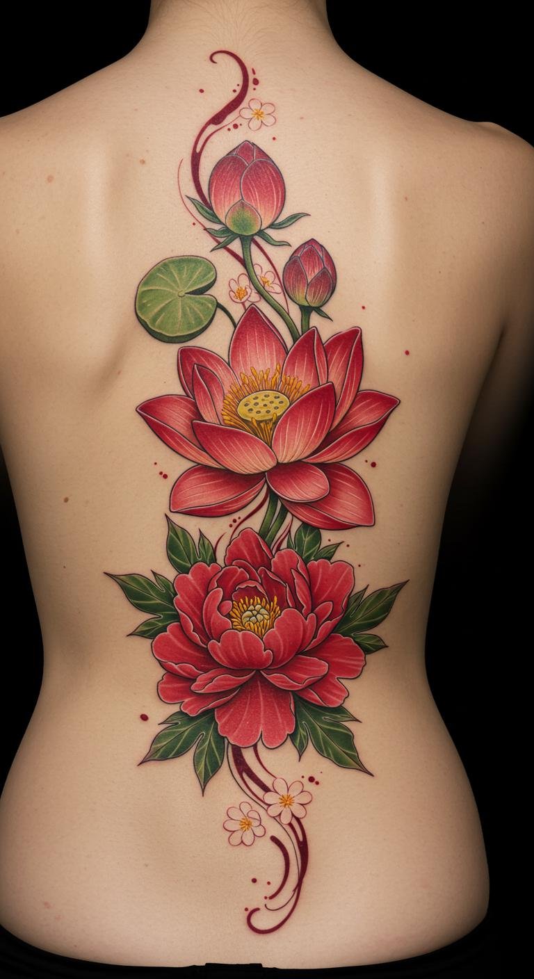 The Red Peony Spine Tattoo is a celebration of beauty and grace, symbolizing love and prosperity.