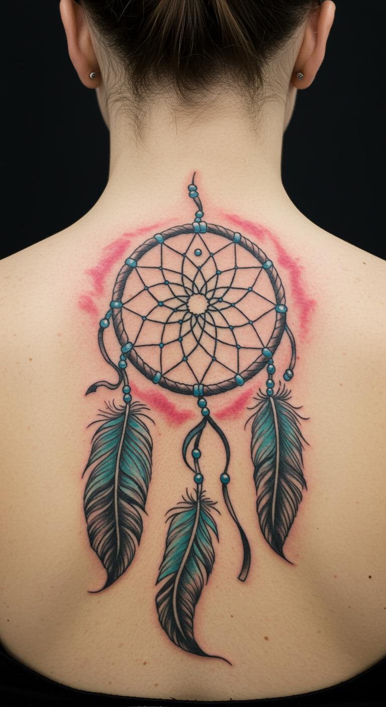 This enchanting dreamcatcher tattoo, placed on the upper back, symbolizes security and self-expression, allowing the wearer to embrace their unique spirit.