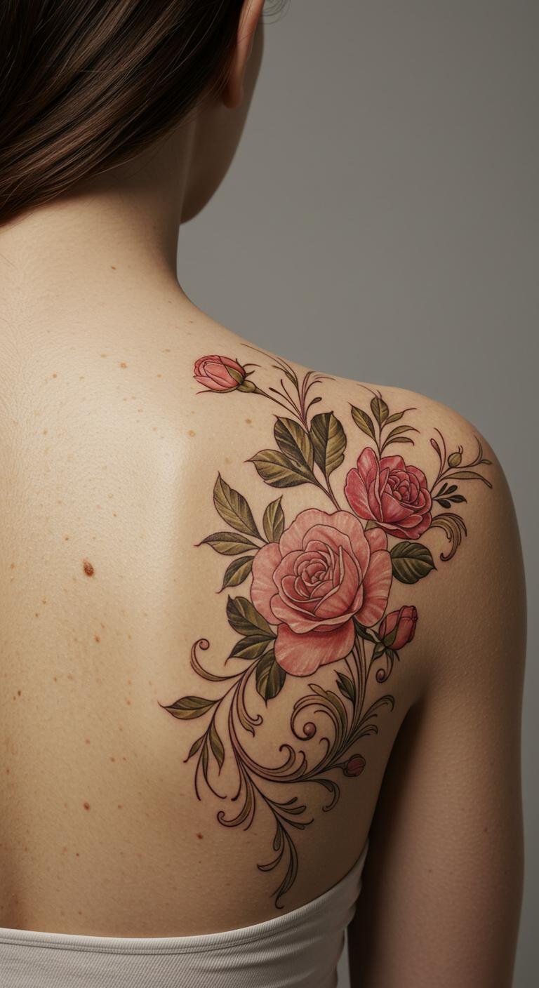 The shoulder blade serves as an ideal canvas for this vintage floral rib tattoo, allowing the intricate design to flow seamlessly with the body’s natural lines.