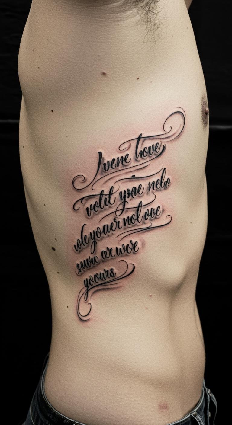The placement of this iconic quote tattoo along the ribcage symbolizes strength and resilience, as the ribs protect vital organs, much like the words protect and inspire the individual.