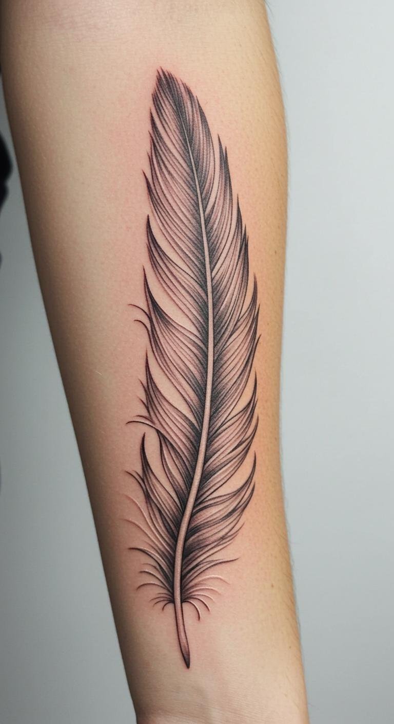 The feather tattoo on the forearm represents freedom and the spirit’s desire to soar, serving as a personal emblem of individuality.