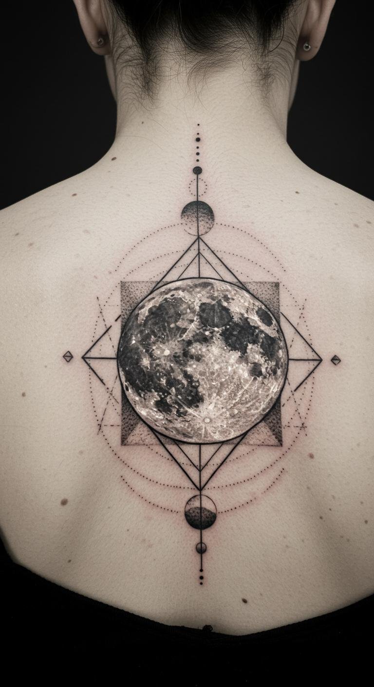 The Geometric Moon Tattoo on the upper back serves as a powerful reminder of one’s connection to the cosmos. It symbolizes freedom, creativity, and the unique spirit of the wearer.