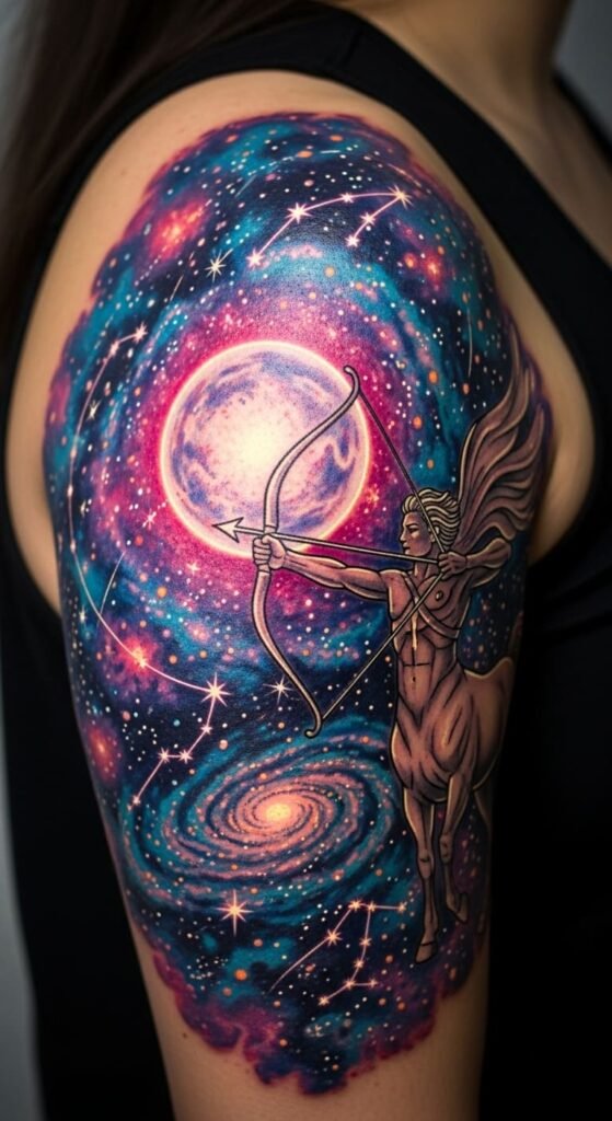 This tattoo embodies the spirit of Sagittarius, reflecting a deep connection to the cosmos and an adventurous lifestyle.
