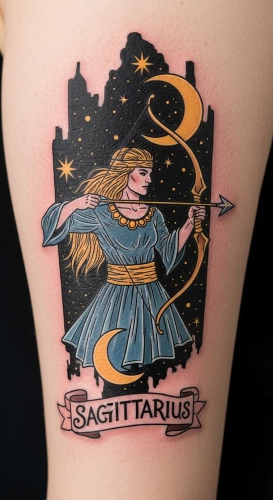 The Celestial Archer tattoo symbolizes the Sagittarius spirit of adventure, freedom, and exploration.