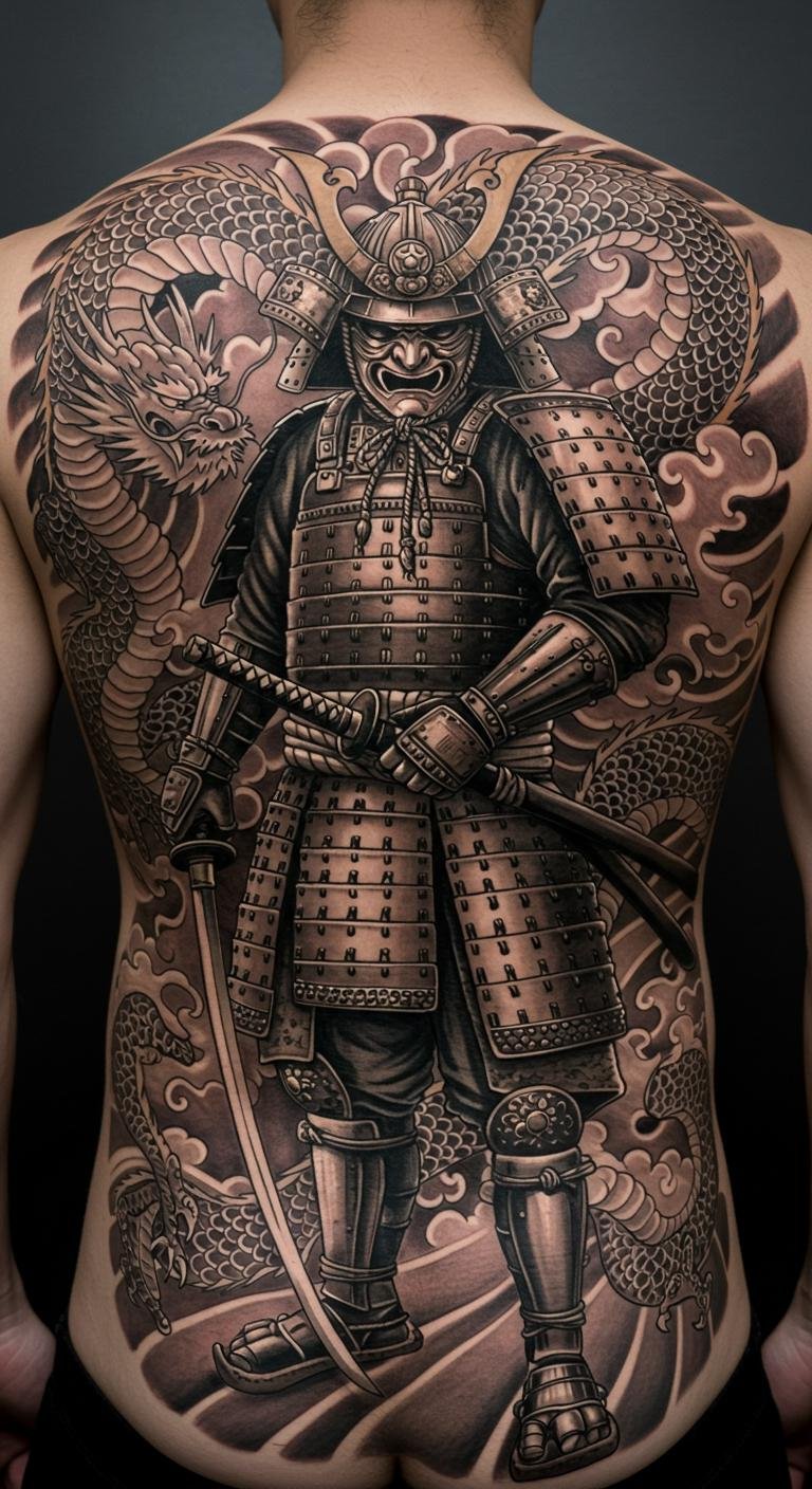 This tattoo embodies the duality of strength and wisdom, where the samurai symbolizes honor and bravery, and the dragon represents ancient knowledge and power.
