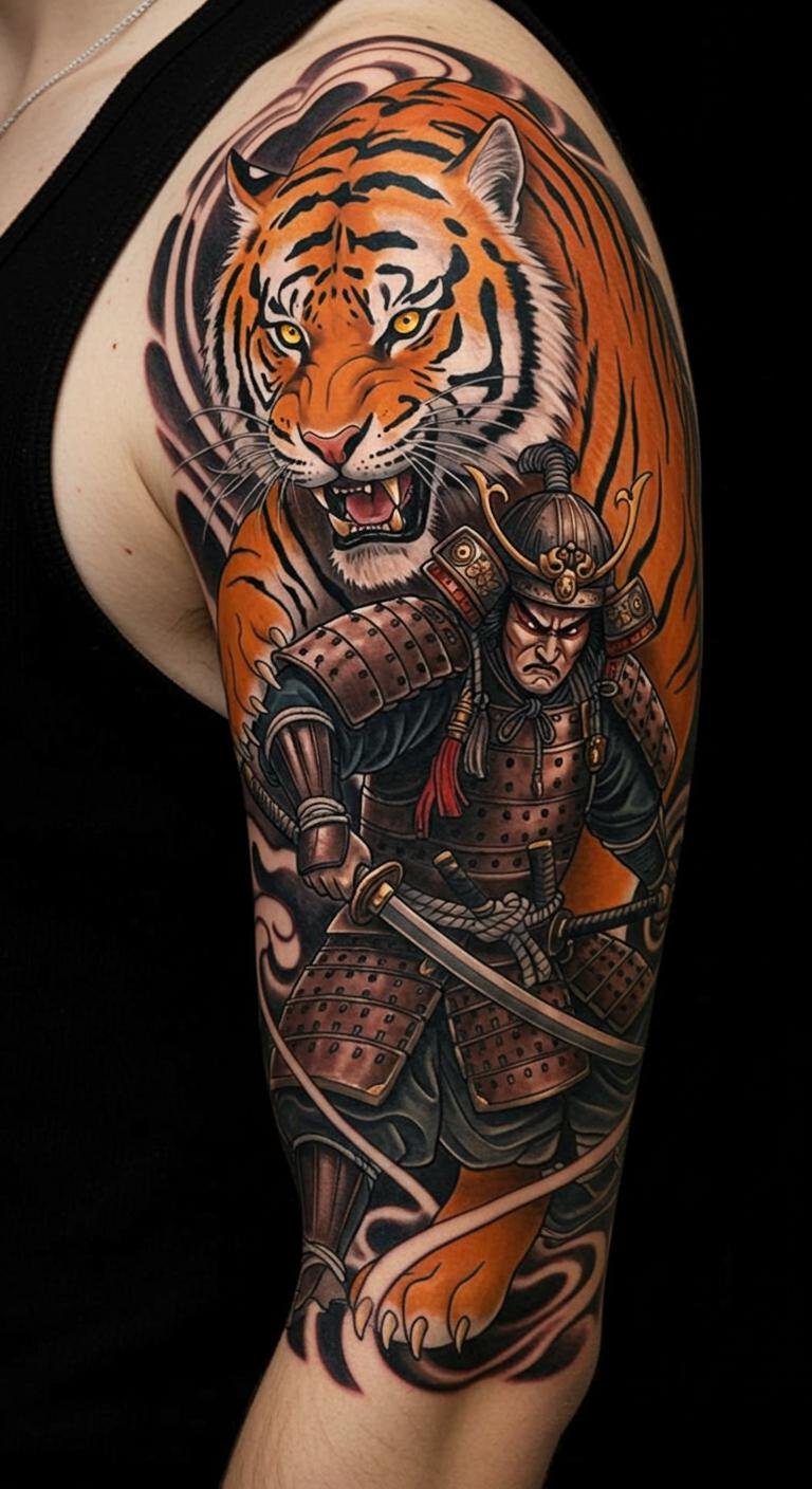 The tattoo is strategically placed on the upper arm, allowing for visibility and a sense of strength. The fierce tiger symbolizes bravery and protection, while the samurai represents honor and loyalty, making this piece a powerful emblem of the warrior spirit.