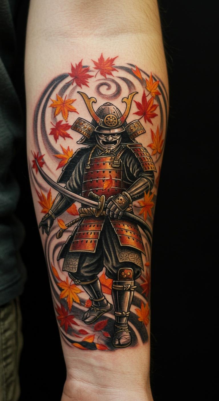The samurai represents courage and honor, while the falling leaves symbolize the beauty of transformation. Together, they convey a message of strength amidst life’s inevitable shifts.