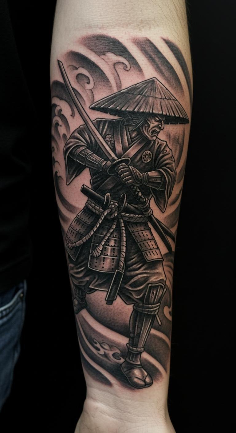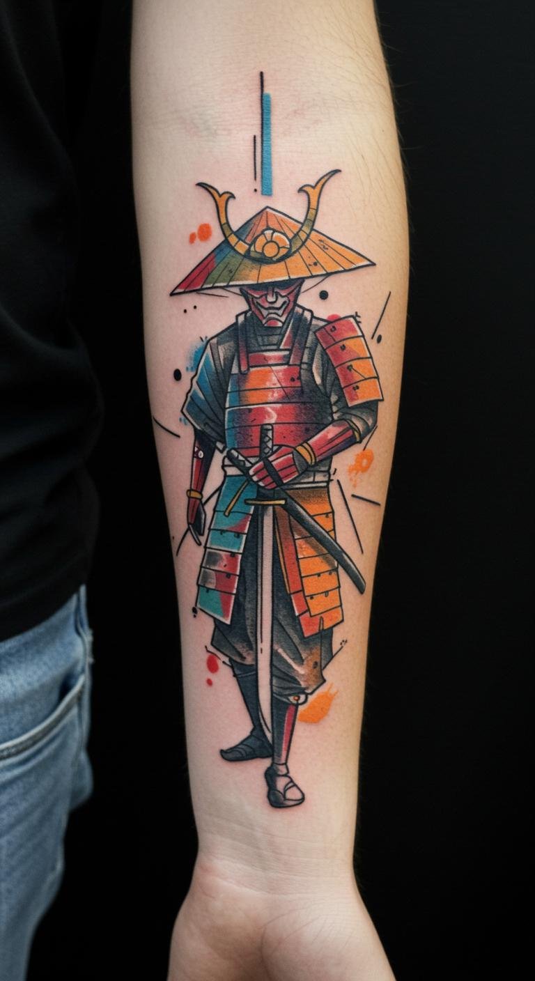 This tattoo design, positioned on the forearm, represents a modern interpretation of the samurai, merging traditional themes with contemporary art.