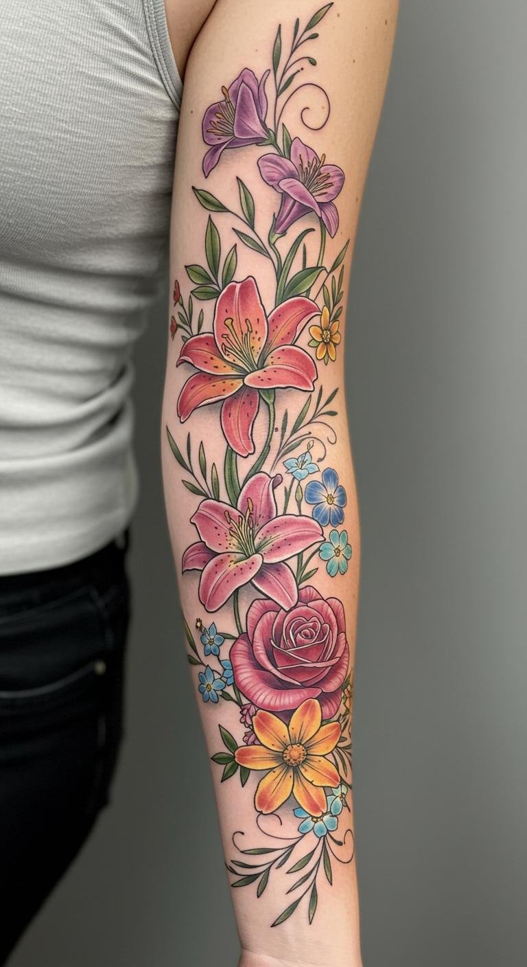 This tattoo design symbolizes growth, beauty, and the essence of individuality. Each flower represents a different aspect of life, from love and passion to resilience and hope.