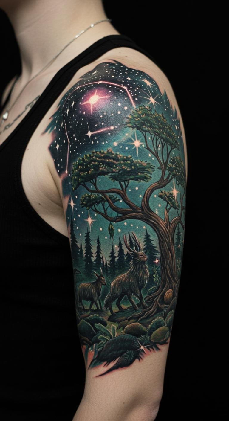 This tattoo wraps around the shoulder, symbolizing the connection between the universe and nature. The stars represent dreams and aspirations, while the trees signify growth and stability.