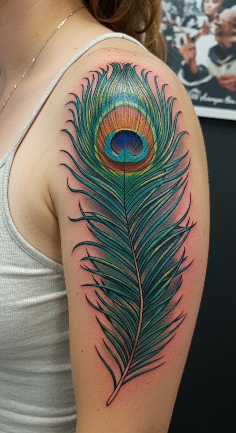 Vibrant Peacock Feather Shoulder Tattoo
