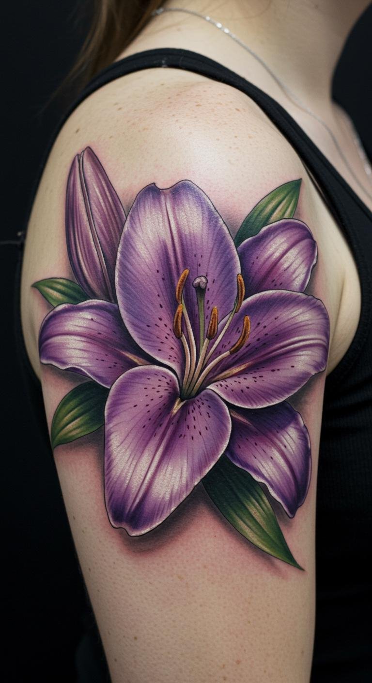 Elegant Purple Lily Shoulder Tattoo