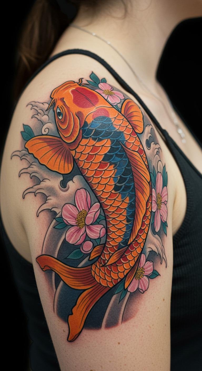 Koi Fish and Floral Shoulder Tattoo
