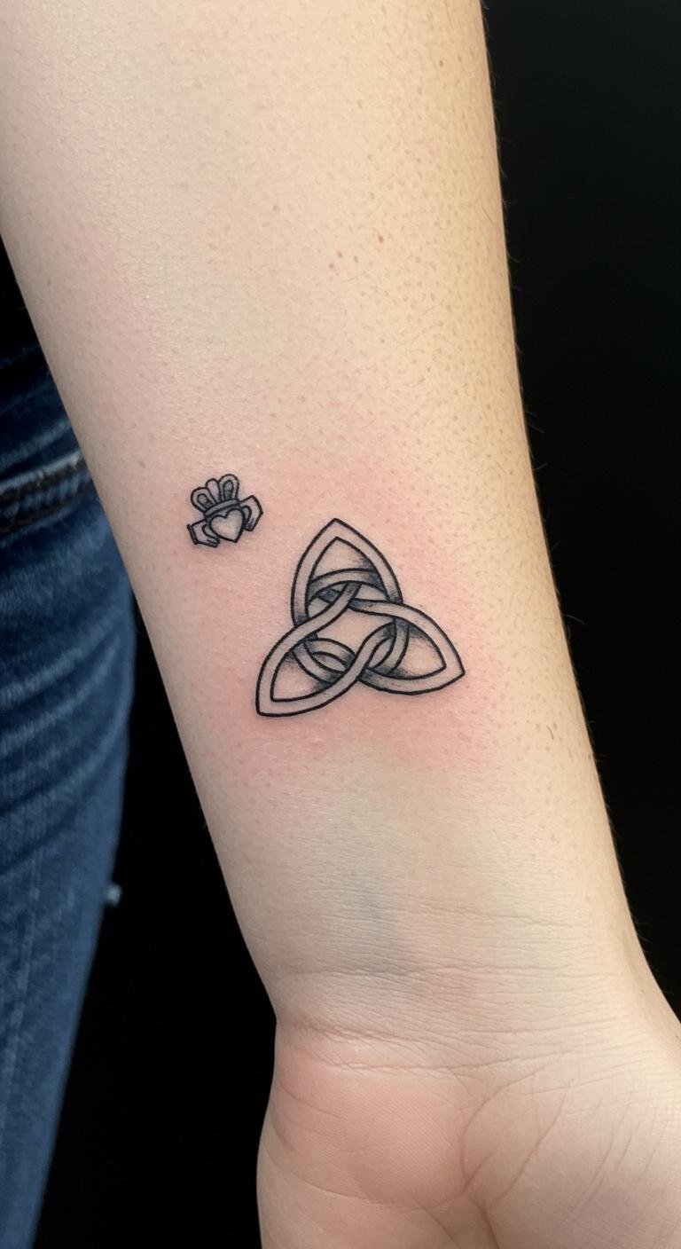 This minimalist tattoo design symbolizes unity and eternal love through the Celtic knot, while the shamrock represents Irish heritage and good fortune.