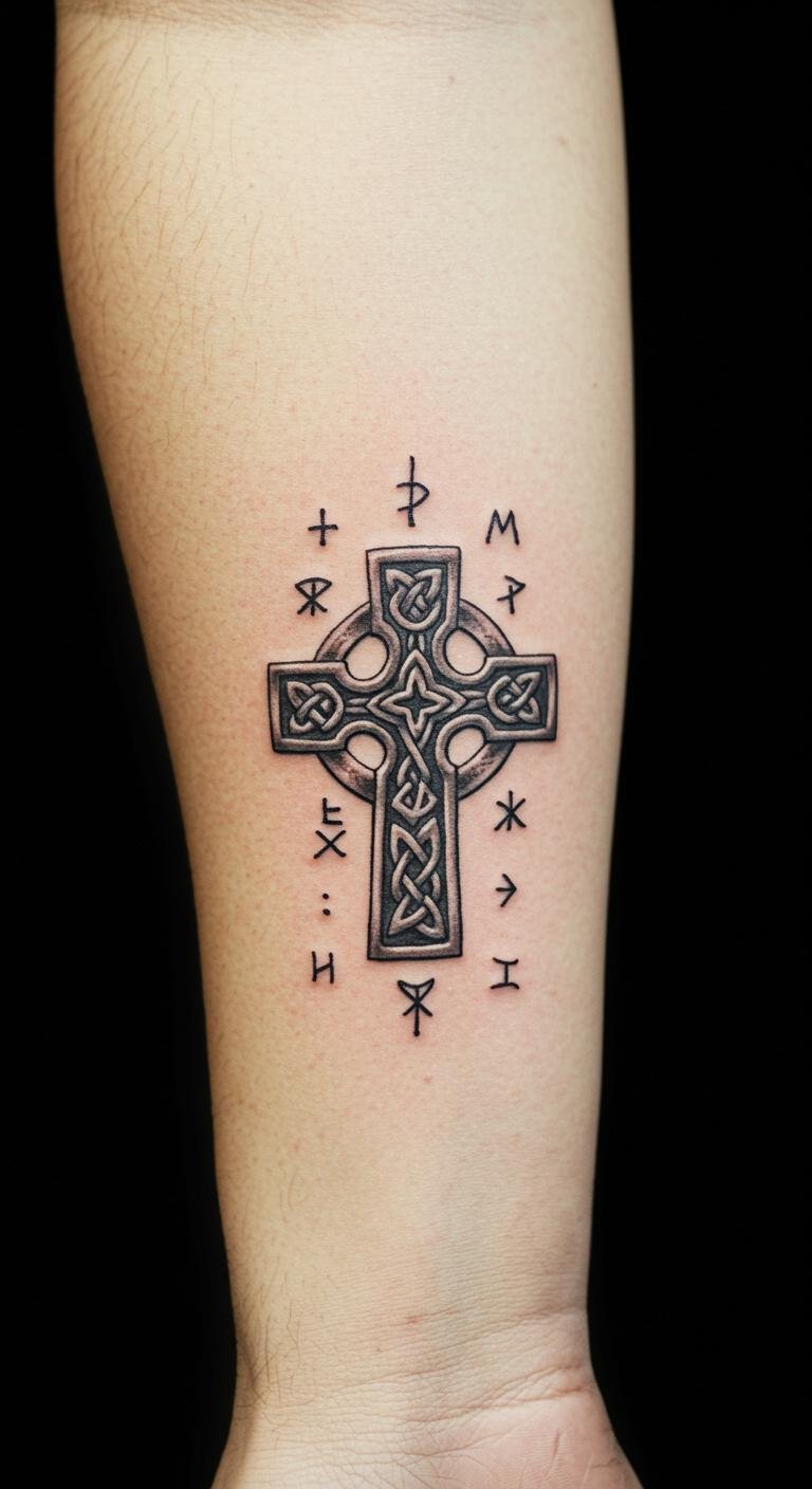 Small Irish Tattoo With Celtic Cross and Spiritual Symbols