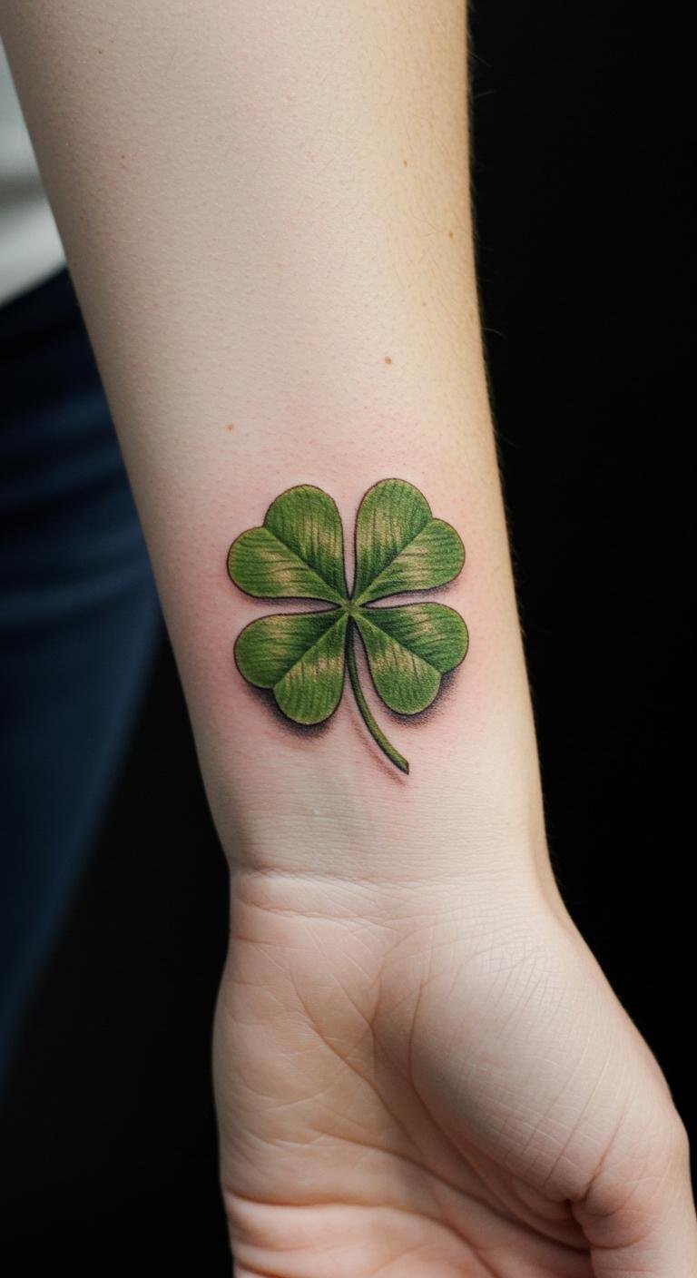 This tattoo symbolizes luck and prosperity, embodying the enchanting meaning of the four-leaf clover.