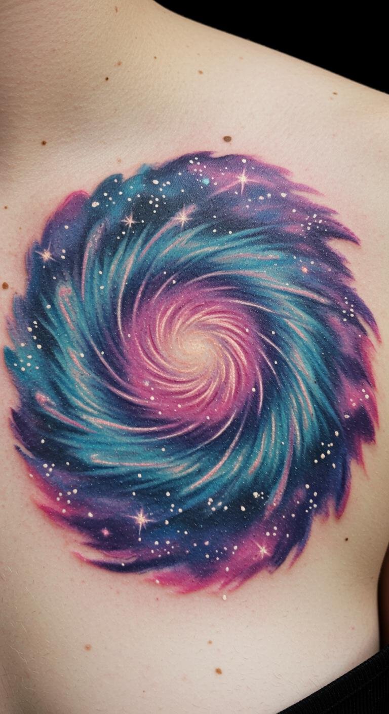 This Cosmic Spiral Galaxy tattoo serves as a powerful emblem of the universe’s vastness and beauty, reflecting a deep connection to the cosmos.