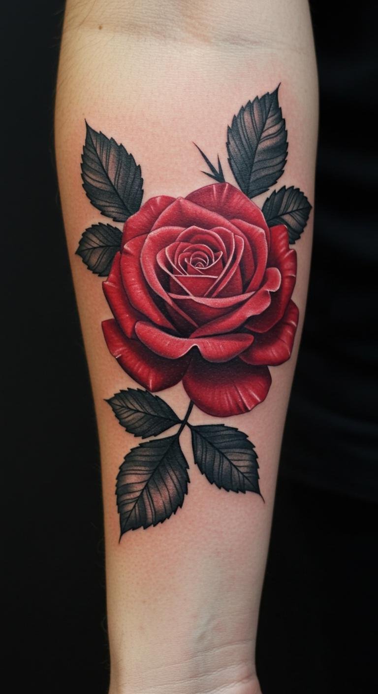 This tattoo symbolizes the duality of love and strength, with the red rose representing deep affection and passion, while the black leaves embody resilience and sophistication.
