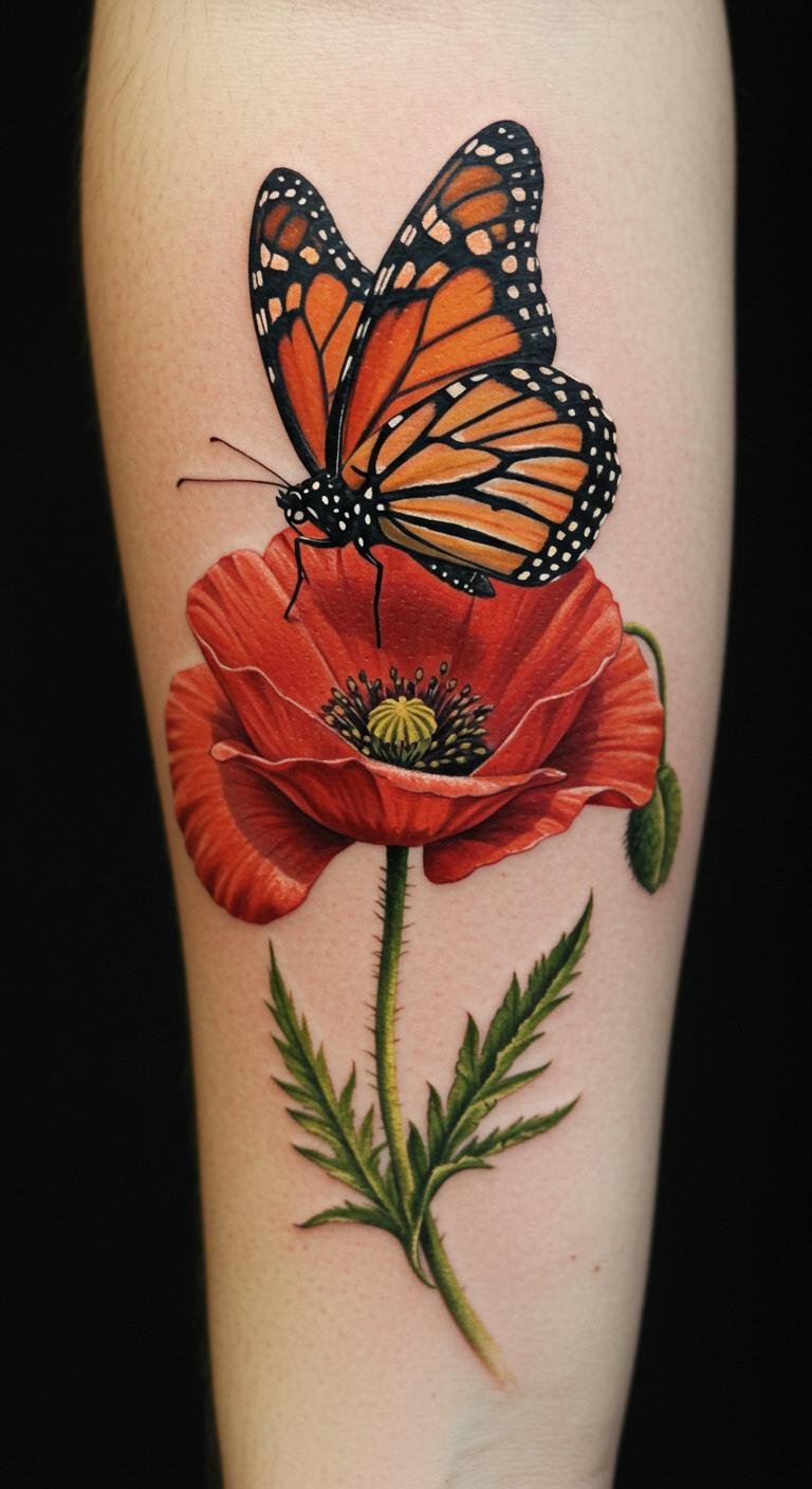 This striking tattoo symbolizes transformation and resilience, with the Monarch Butterfly representing freedom and metamorphosis, while the Poppy Flower embodies beauty and remembrance.