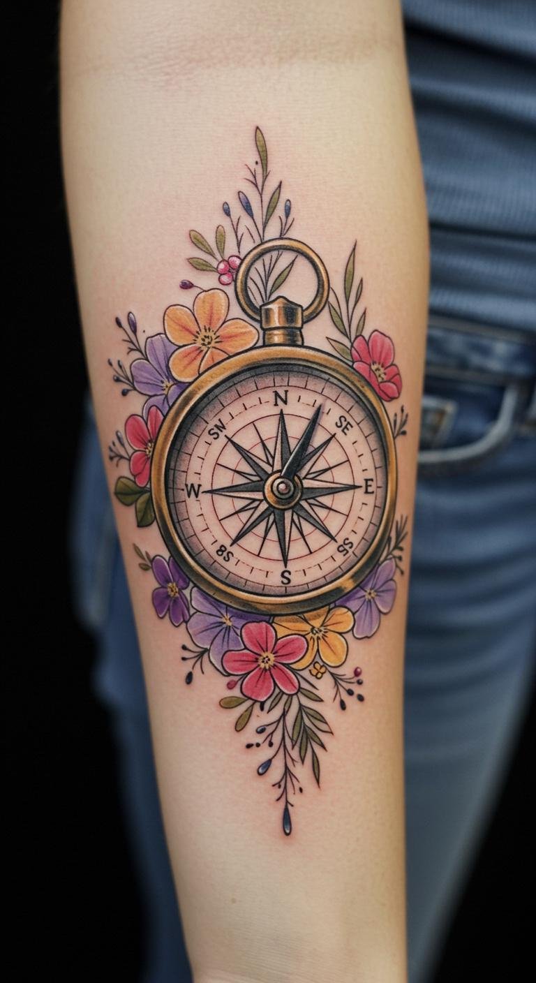 This tattoo design embodies the spirit of adventure and exploration, with the vintage compass symbolizing guidance through life’s journeys.