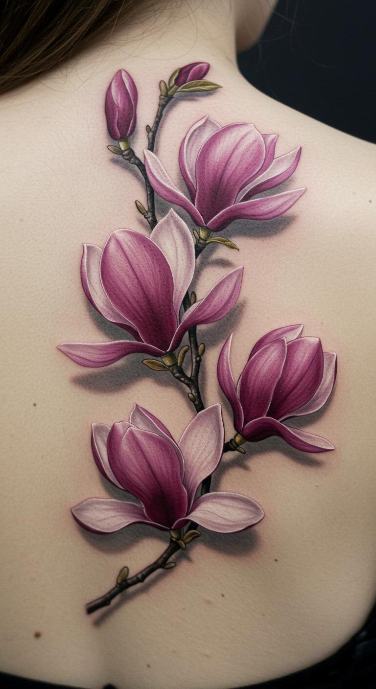 The magnolia blossoms symbolize dignity and perseverance, making this tattoo not just a beautiful design but also a powerful reminder of inner strength.