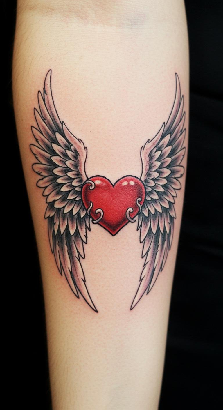 The heart with angel wings tattoo on the forearm serves as a poignant tribute, intertwining love and remembrance in a striking design.