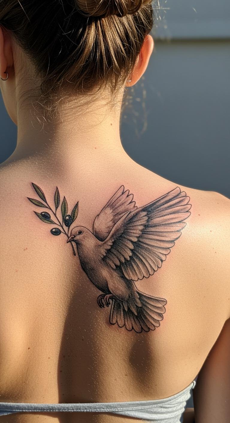 Symbolizing peace and hope, the dove with an olive branch tattoo creates a powerful visual statement on the upper back.